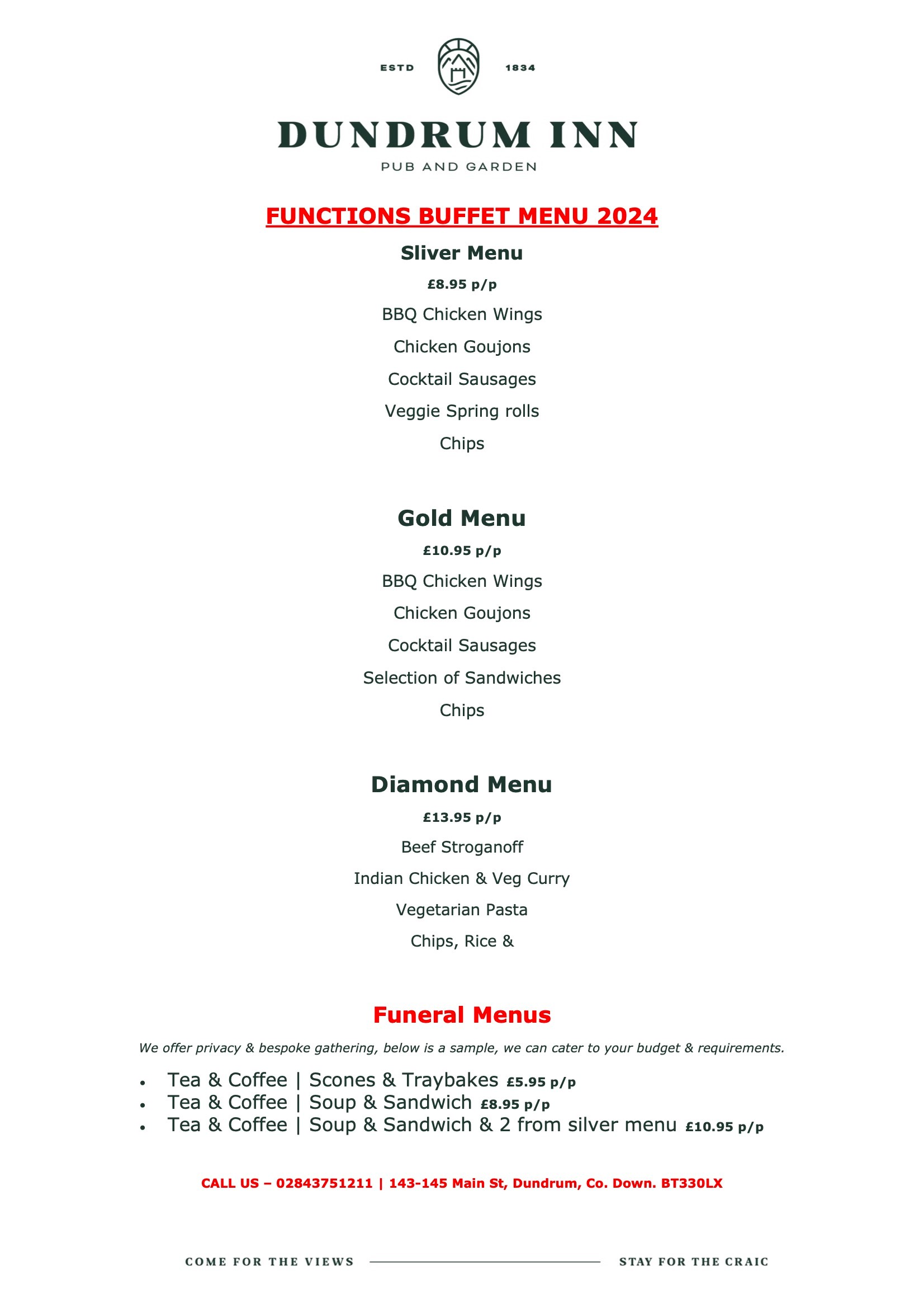 Funeral Buffet menus from £6.50pp. Evening finger food from £10pp.